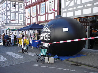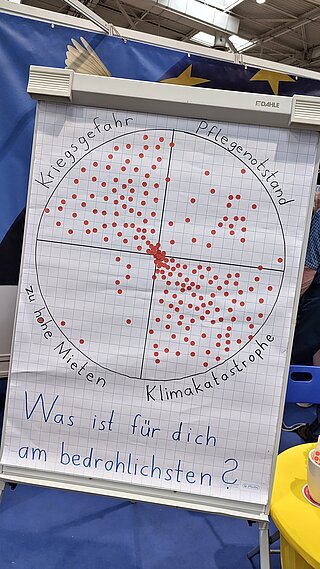 Zusätzlich zum Räderwerk hatten wir dieses Jahr an zwei Tagen ein neues Interaktions-Element: Papierbögen auf Ständern, auf denen Besucher kleine Punkte quasi als „Abstimmung“ kleben konnten. Dieses Verfahren hatten wir im Gegensatz zum Räderwerk nicht ganz exklusiv, aber es wurde dennoch gut angenommen und hat uns viele Gesprächseinstiege geliefert. Wir sehen die Fairconomy als bestes Mittel gegen viele der aktuellen Krisen. Um von Besuchern zu hören, welche Krise sie am meisten interessieren könnte, stellten wir die Frage „Was ist für dich am bedrohlichsten“. Am ersten Tag waren die vier Antwort-Felder „Kriegsgefahr“, „Pflegenotstand“, „zu hohe Mieten“ und „Klimakatastrophe“. Mit Abstand die meisten Punkte erhielten „Klimakatatrophe“ und „Kriegsgefahr“. Als Reaktion darauf haben wir am nächsten Tag die Felder etwas angepasst: „Kriegsgefahr“, „Klimakatastrophe“, „finanzielle Unsicherheit“ und „etwas anderes“ waren jetzt die Möglichkeiten. Im Ergebnis setzten sich trotzdem die beiden Spitzenreiter des Vortags wieder deutlich durch.